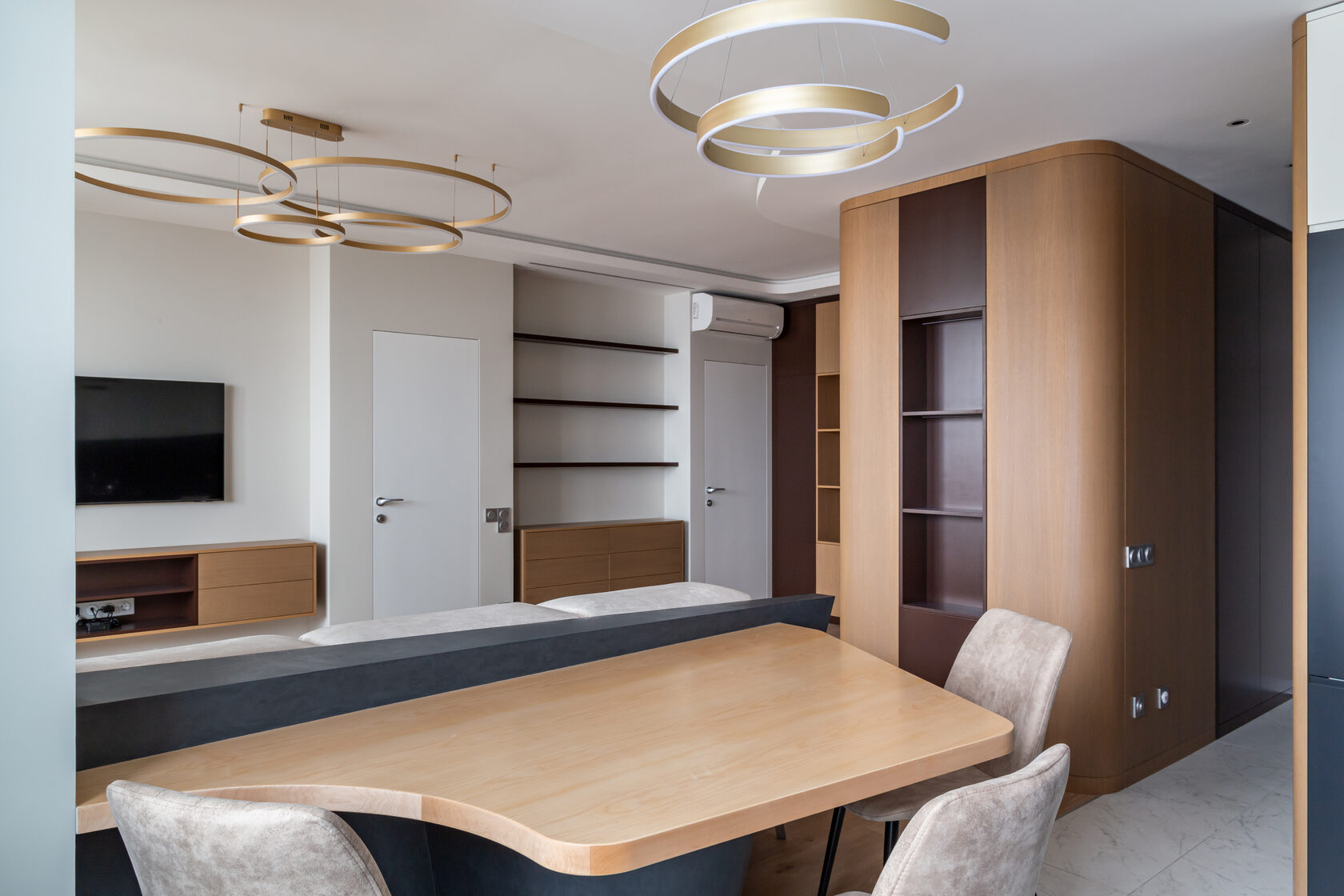 Вместительные шкафы разнообразной формы выполнены в едином стиле. Они гармонично переходят из одного в другой и сочетают в себе светлые и тёмные оттенки. Углы мебели закруглены. Обеденный стол изготовлен из массива и шпона клёна. Кроме того, для гостиной были созданы тумбы и открытые полки, расположенные в нишах стены.