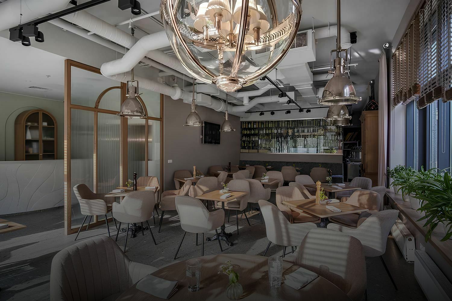 Большая прозрачная перегородка, декорированная деревом под арку. Она разделяет зону, отведённую для приёма посетителей и помещение кафе со столиками, которые также сделаны руками наших мастеров.